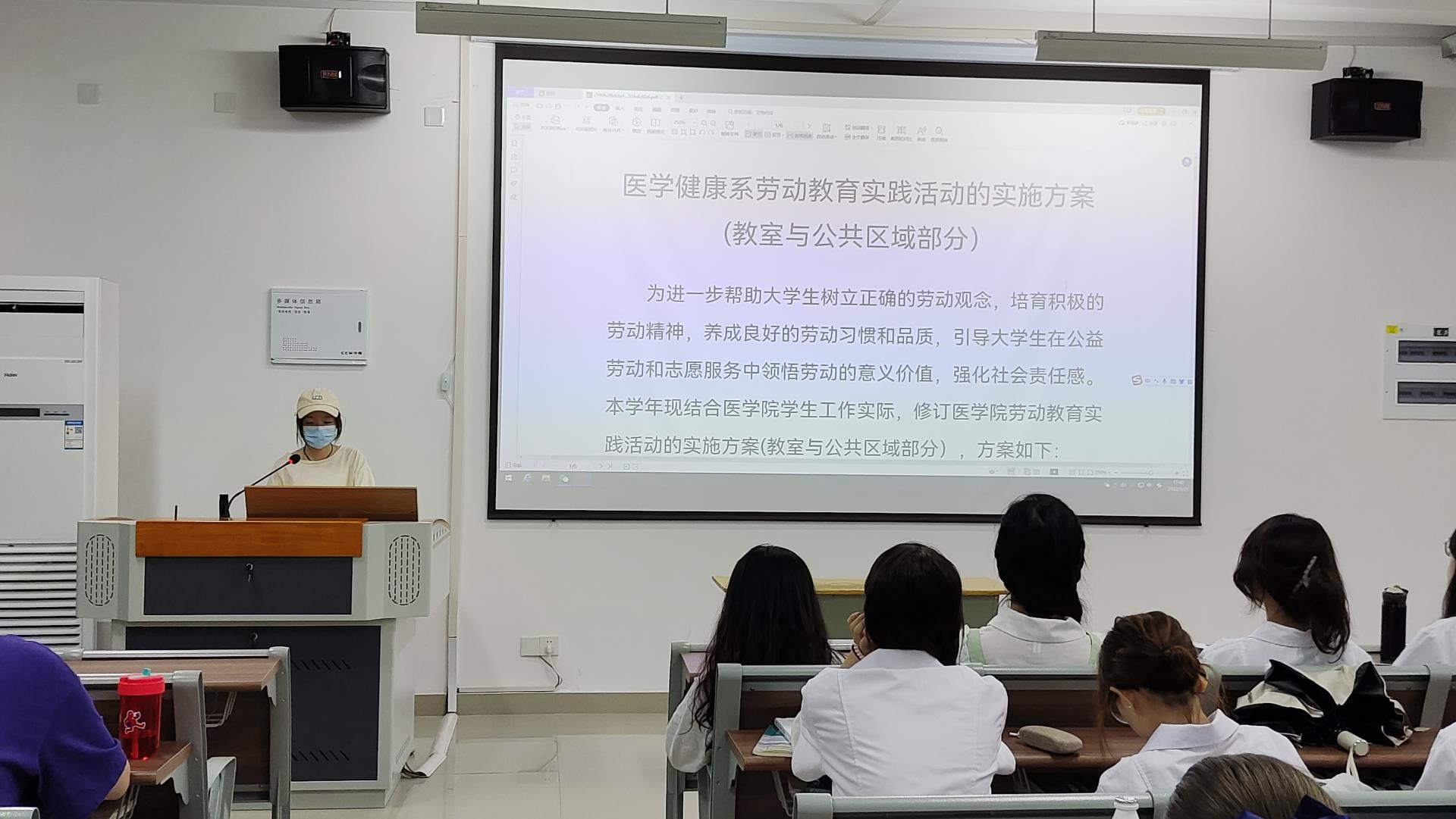 第5周公共区域卫生由护理2105班承包。为了贯彻落实新时代劳动教育精神,劳社部为护理2105班的同学上了生动的劳动教育课,并详细的介绍了工作计划与细节,保证劳动教育的顺利开展。