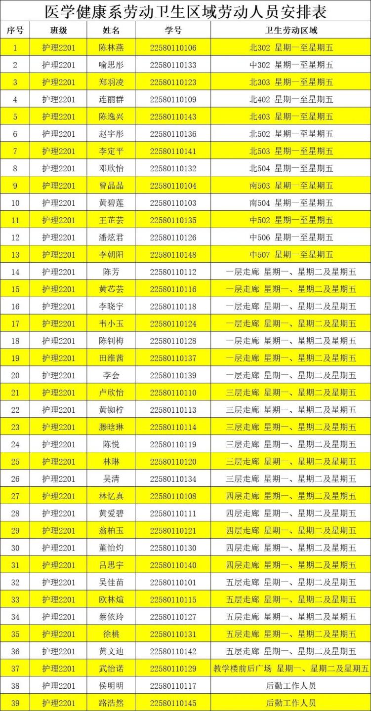 接下来,公示医学健康系第11周公共卫生区域劳动人员安排,请查收~