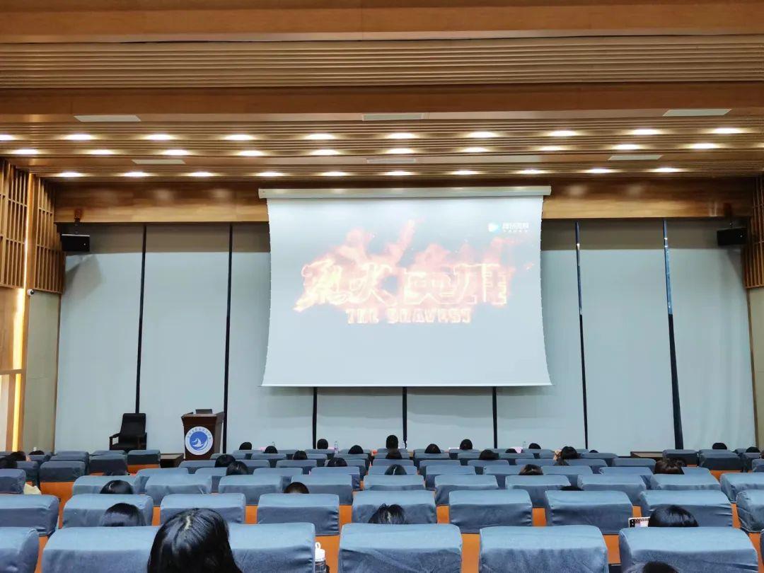 观影过程中,全体同学全神贯注,现场气氛安静肃穆,当看到银幕上的战友舍生忘死,以血肉之躯与烈火搏斗的场景时,大家热血澎湃。消防员的坚毅和勇敢精神穿透银幕感染着在场每一位师生!