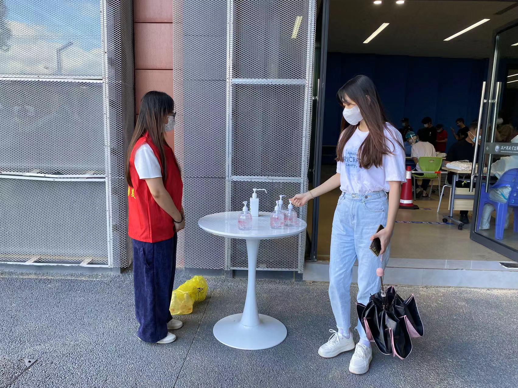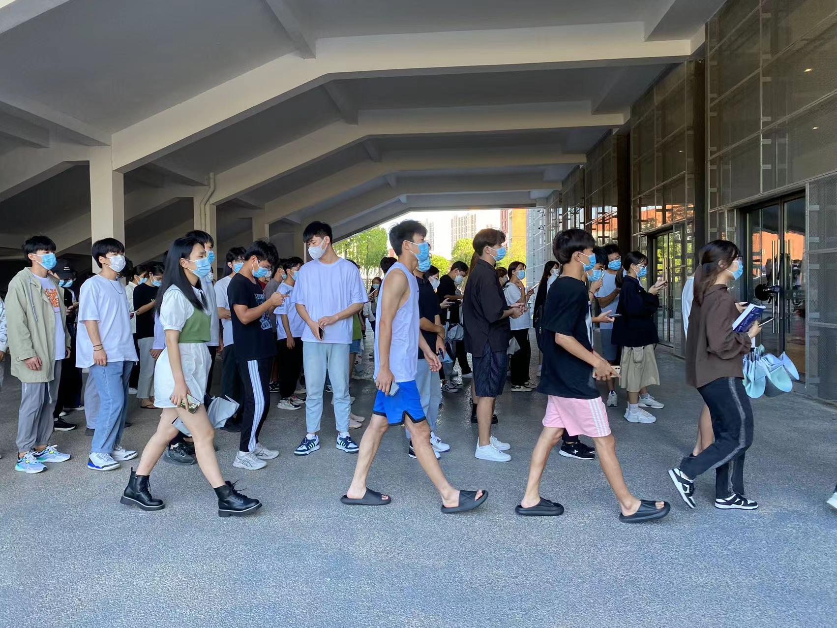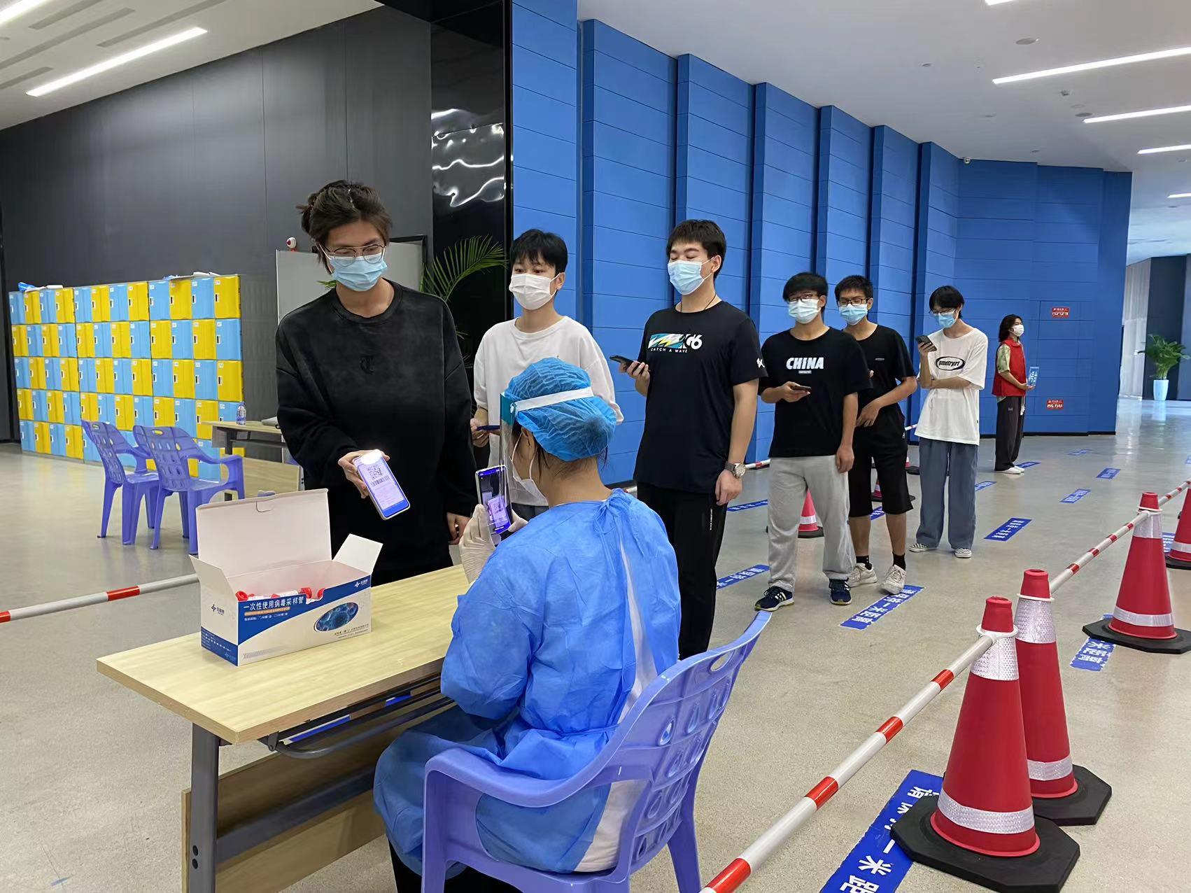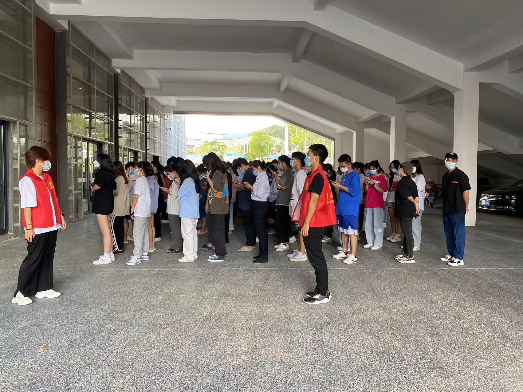 核酸检测过程中,志愿者们积极维持现场秩序,被抽检的同学们佩戴口罩、提前扫码、志愿者协助核对身份信息,严格执行“一米线”规定,全力配合医护人员进行咽拭子检测,认真遵循分批进场、单流向通道采样隔离模式,避免检测过程中造成人员聚集,采样工作有条不紊地进行。